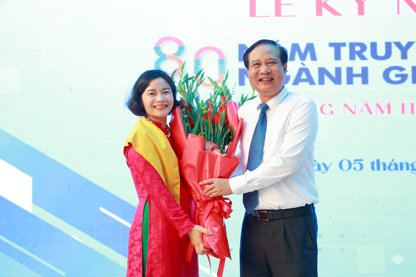 Đồng chí Nguyễn Công Thành – Bí thư Đảng ủy, Chủ tịch Hội đồng nhân dân phường Ngọc Hà tặng hoa chúc mừng thầy trò nhà trường