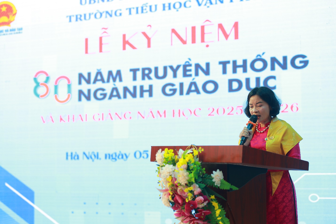 Trong bài phát biểu khai giảng đầy tâm huyết, cô giáo Hiệu trưởng Phùng Tố Nga đã tổng kết những thành tích đáng tự hào của năm học 2024-2025 gồm 1 giải Quốc gia, 25 giải Thành phố, 85 giải cấp Quận trong các cuộc thi học sinh giỏi, cùng danh hiệu tập thể lao động tiên tiến của nhà trường. Đây là minh chứng rõ nét cho sự nỗ lực không ngừng, tinh thần đoàn kết, kỷ cương, đổi mới, sáng tạo của thầy và trò Vạn Phúc. Bài phát biểu cũng nhấn mạnh tầm quan trọng của việc xây dựng môi trường giáo dục mà trong đó, các em học sinh là nhân tố trung tâm. Nhà trường kêu gọi các em hãy luôn tự giác, tự chủ, có ý thức và trách nhiệm với bản thân, phấn đấu mỗi ngày đến trường là một hành động đẹp, một lời nói hay.