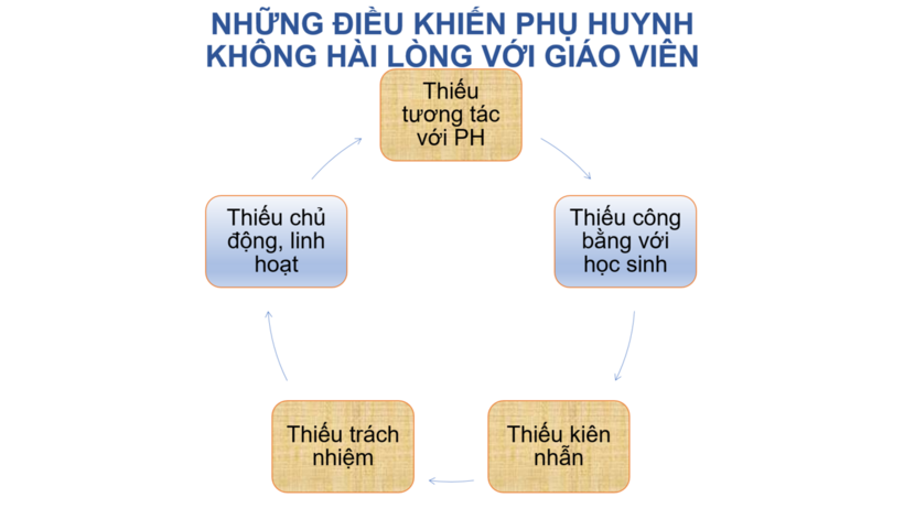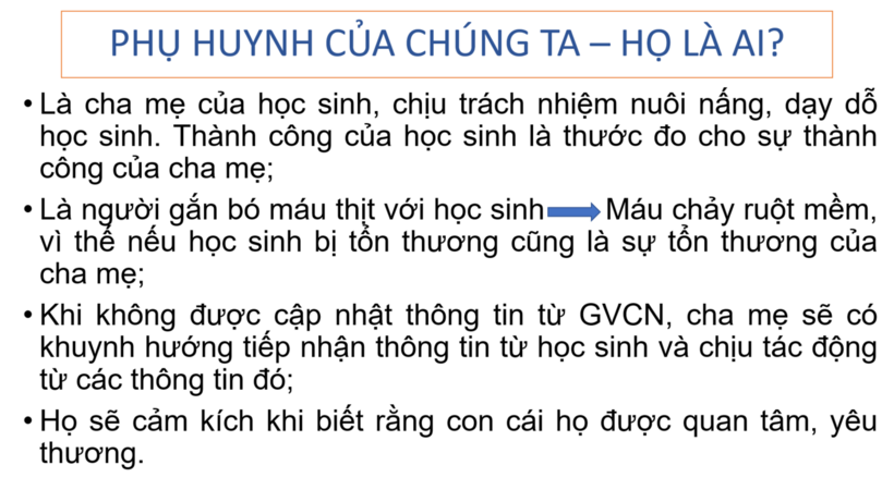 Theo Tiến sĩ Nguyễn Thị Hường: “Phụ huynh là cha mẹ của học sinh, chịu trách nhiệm nuôi nấng, dạy dỗ học sinh. Thành công của học sinh là thước đo cho sự thành công của cha mẹ.” Niềm vui gắn với thành công của con, vậy nhưng khi con em có những thành tích không tốt, phụ huynh lại có xu hướng ít nhận trách nhiệm về bản thân mình và thường đổ lỗi cho thầy cô giáo. Nếu không tạo được sự tin tưởng, sẻ chia với phụ huynh, việc tương tác, trao đổi giữa gia đình - nhà trường sẽ ngày càng gặp khó khăn.