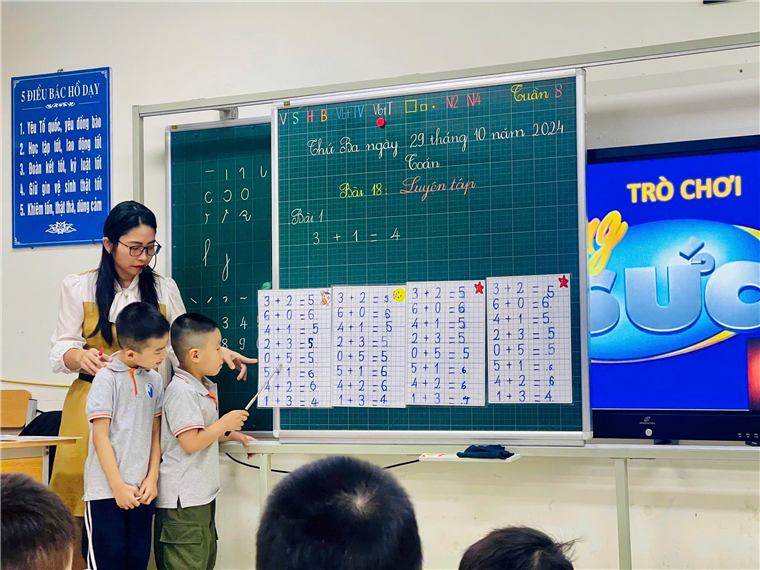 Tiết Toán của cô giáo Lưu Khánh Ly - GVCN lớp 1A2 với bài “Luyện tập” đã tạo hứng thú học tập tốt cho các em học sinh. Giờ học trở nên sôi nổi bởi ngoài sự truyền đạt kiến thức nhẹ nhàng, cô còn lồng ghép rất nhiều các trò chơi giúp học sinh vừa chơi mà cũng vừa học. Với phong cách giảng dạy nhẹ nhàng, gần gũi, cô giáo đã khéo léo giúp học sinh nắm chắc kiến thức mới, vận dụng tốt kiến thức để thực hiện tính trong phạm vi 10.