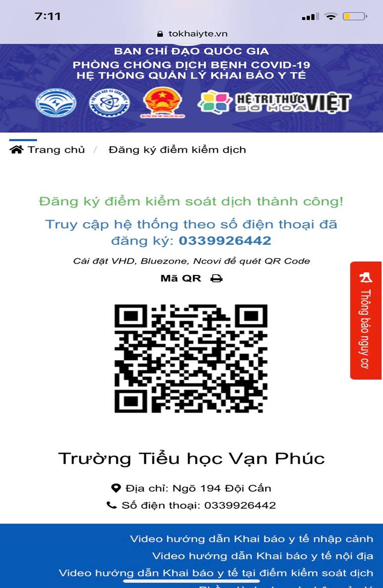 Thực hiện Công văn số 311/UBND-YT ngày 01/3/2021 của UBND quân Ba Đình về việc đăng ký thông tin điểm kiểm dịch và quét mã đến và đi cho cán bộ của cơ quan, cán bộ, người dân đến làm việc, ngày 02/3/2021 Trường Tiểu học Vạn Phúc đã đăng kí thành công điểm kiểm soát dịch.