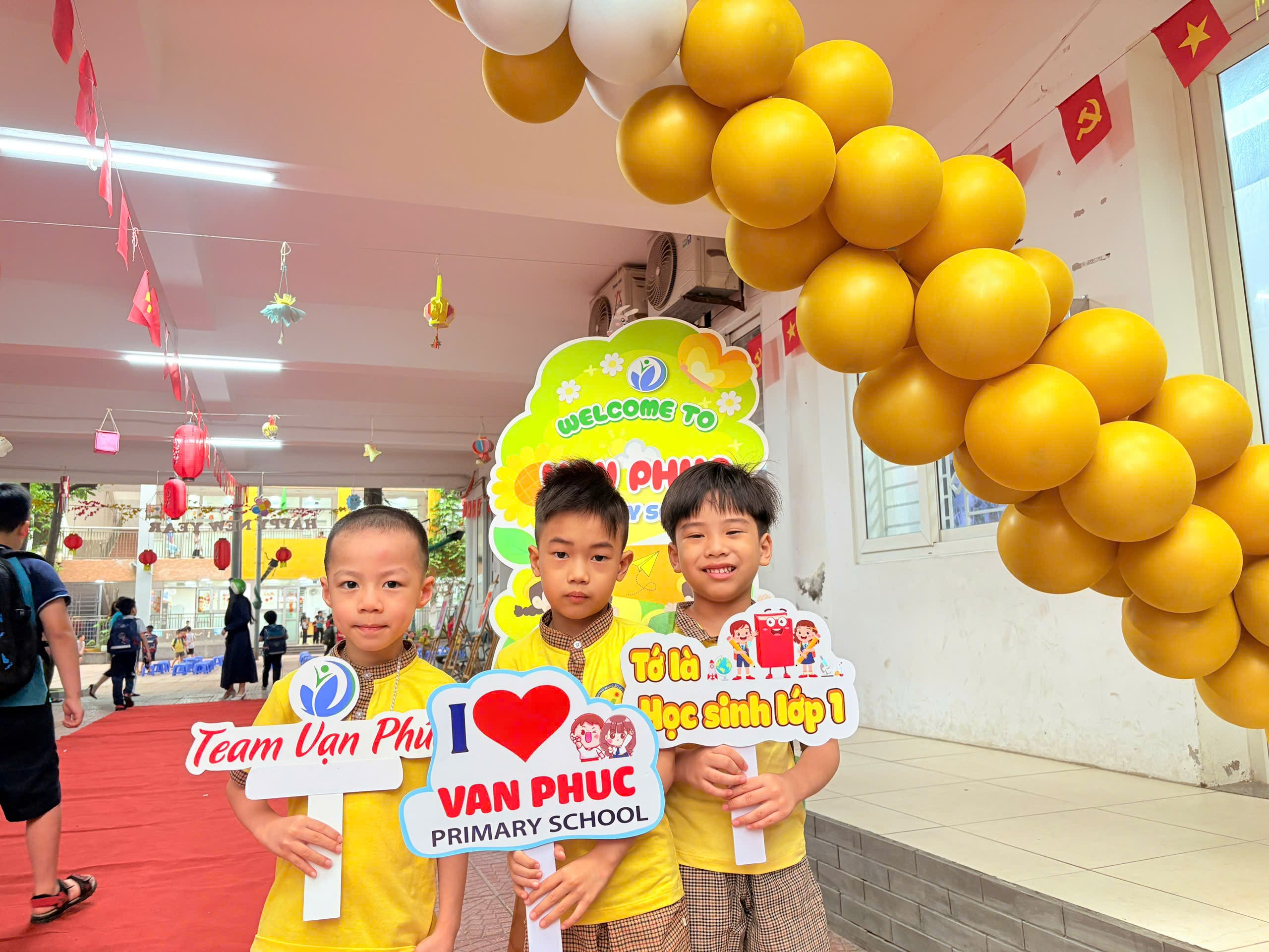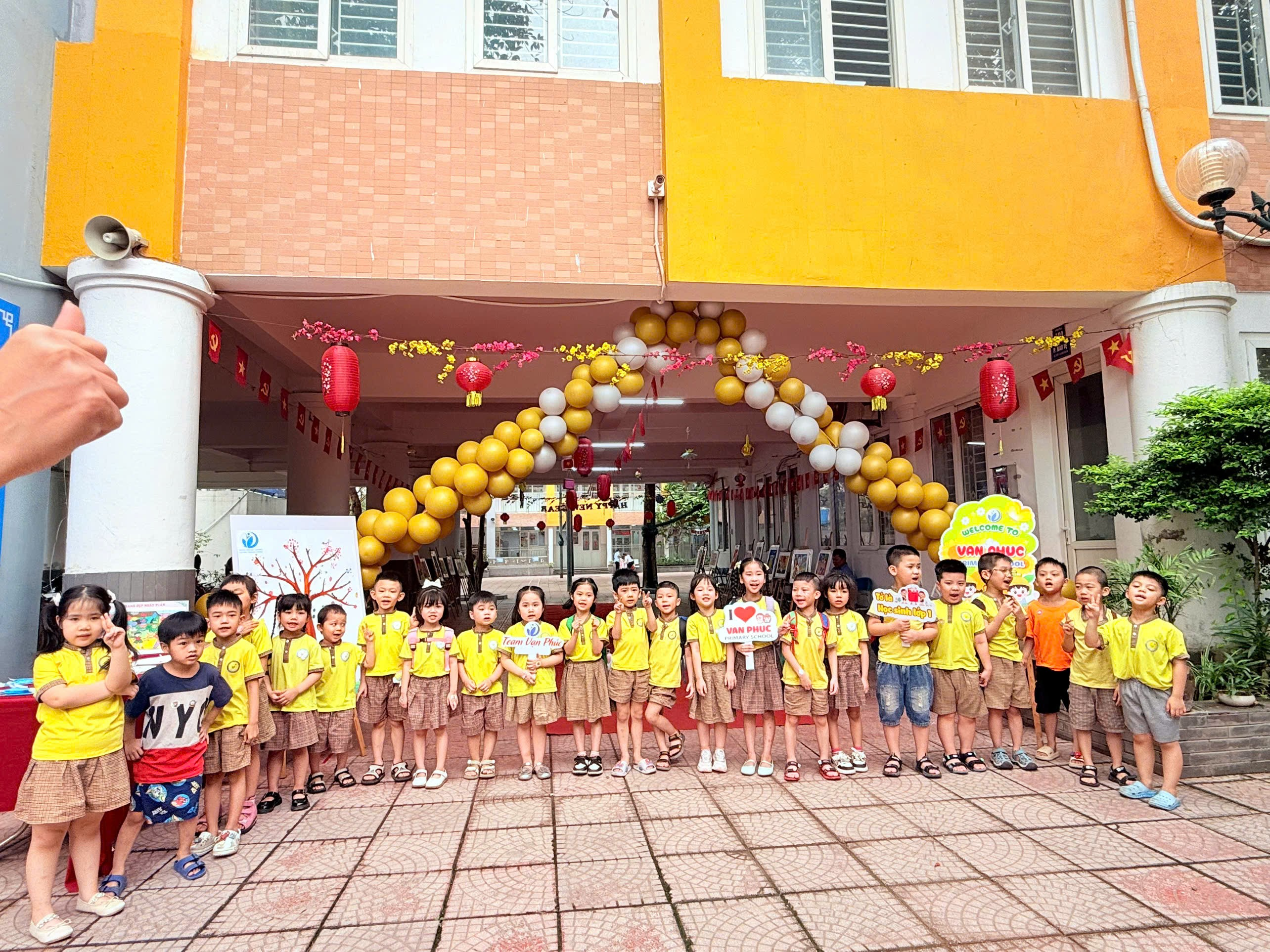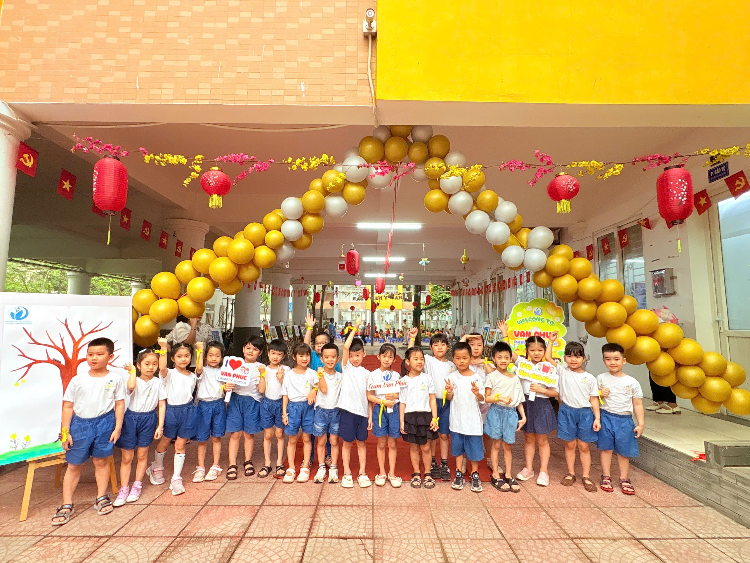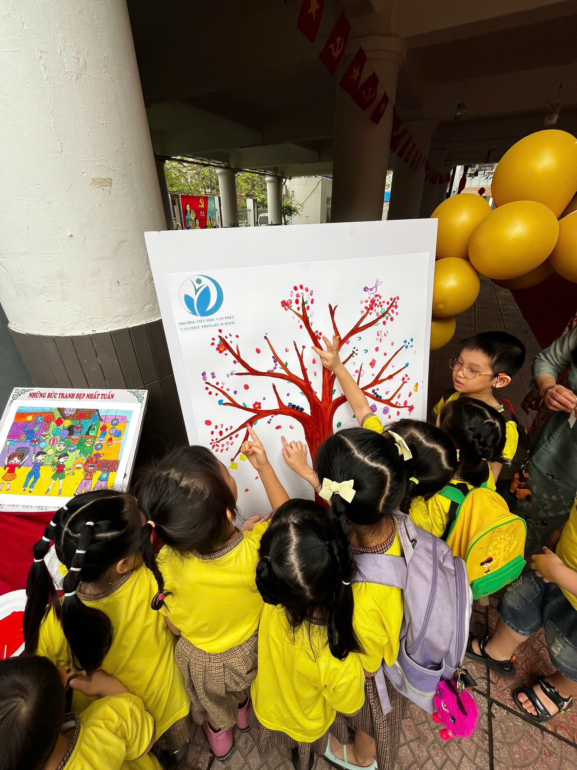 Học sinh mầm non hào hứng check-in tại khu vực sân trường Trường Tiểu học Vạn Phúc