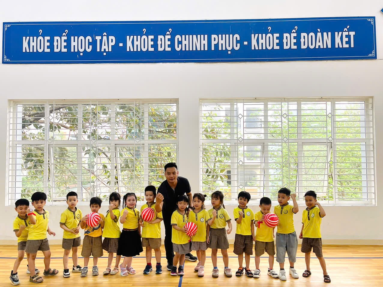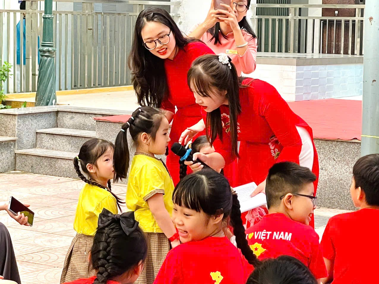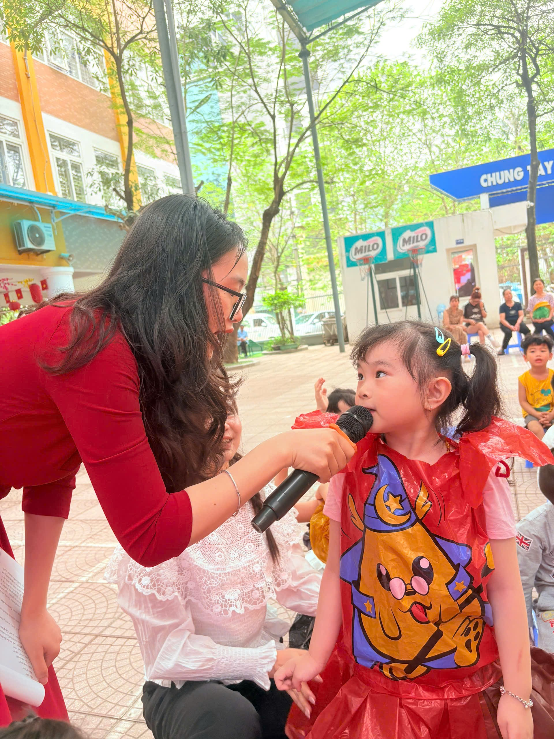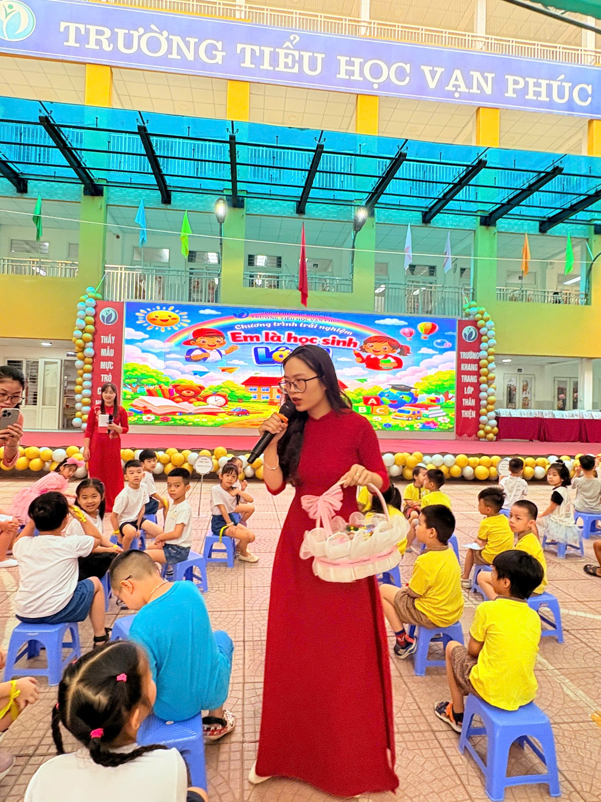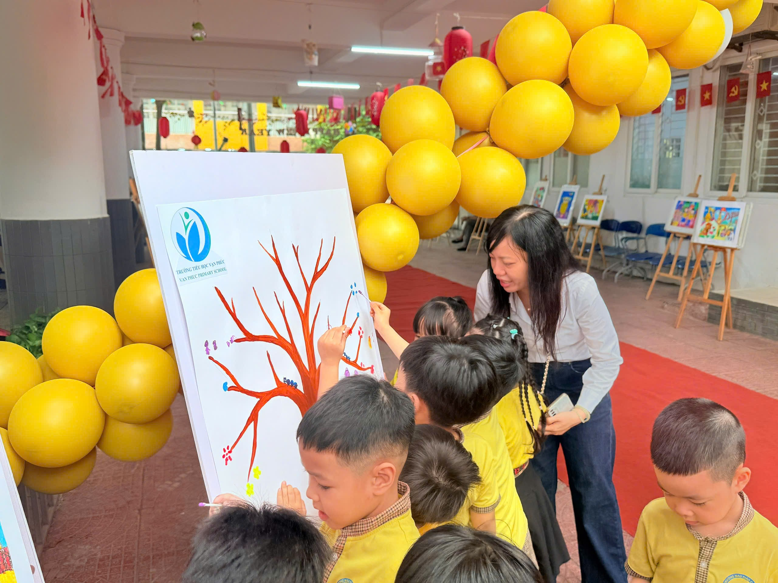 Học sinh mầm non hào hứng check-in tại khu vực sân trường Trường Tiểu học Vạn Phúc