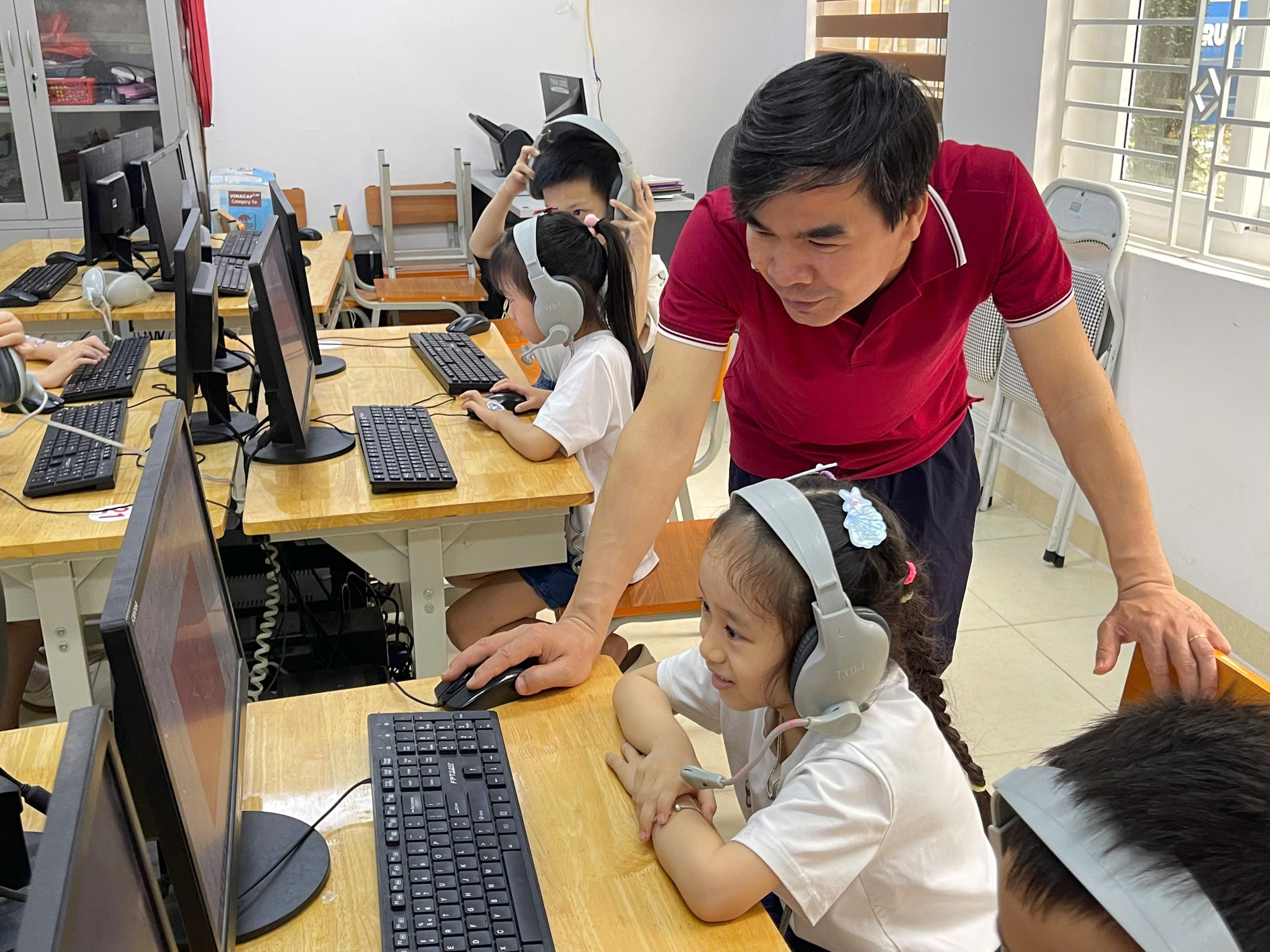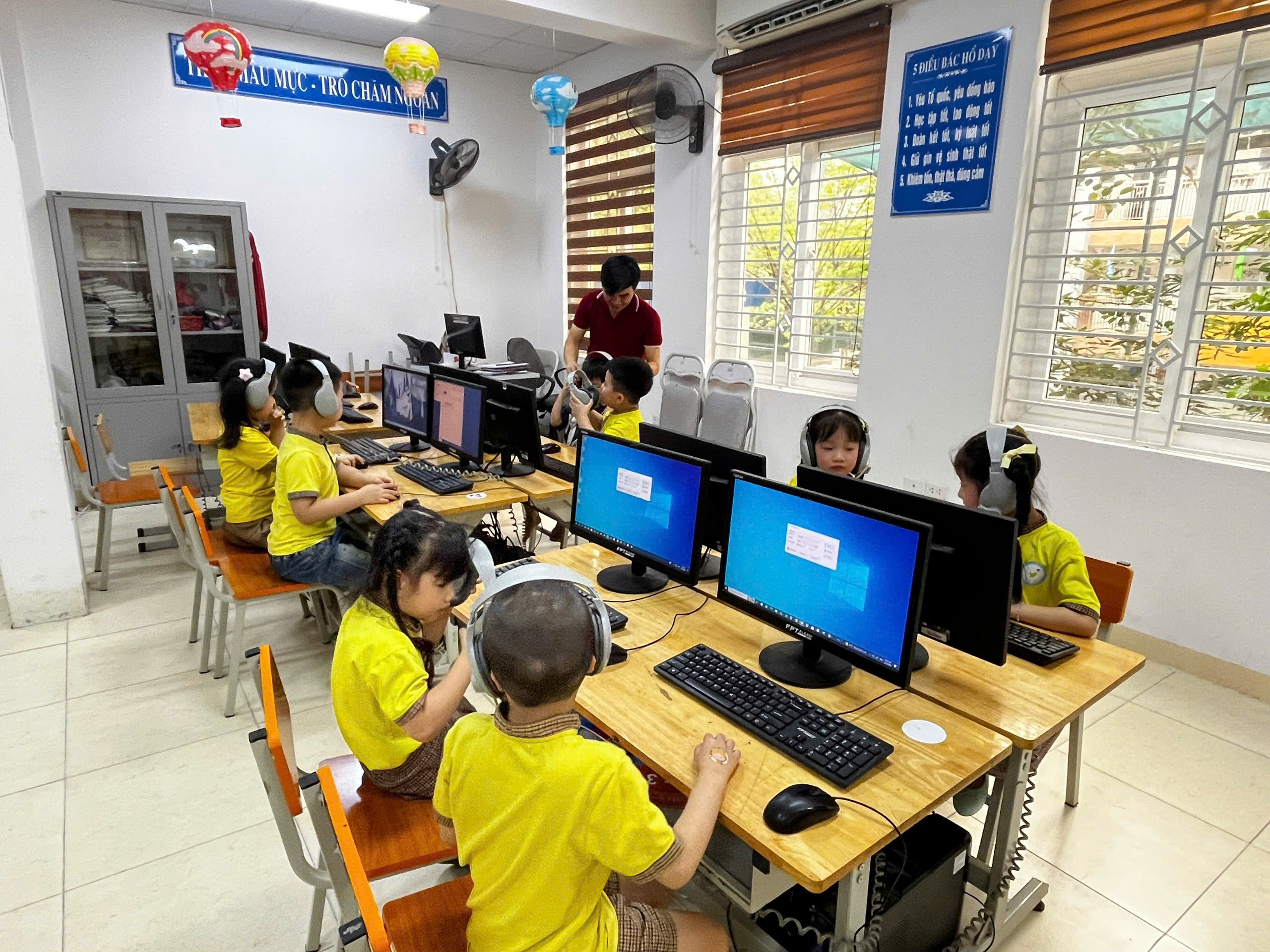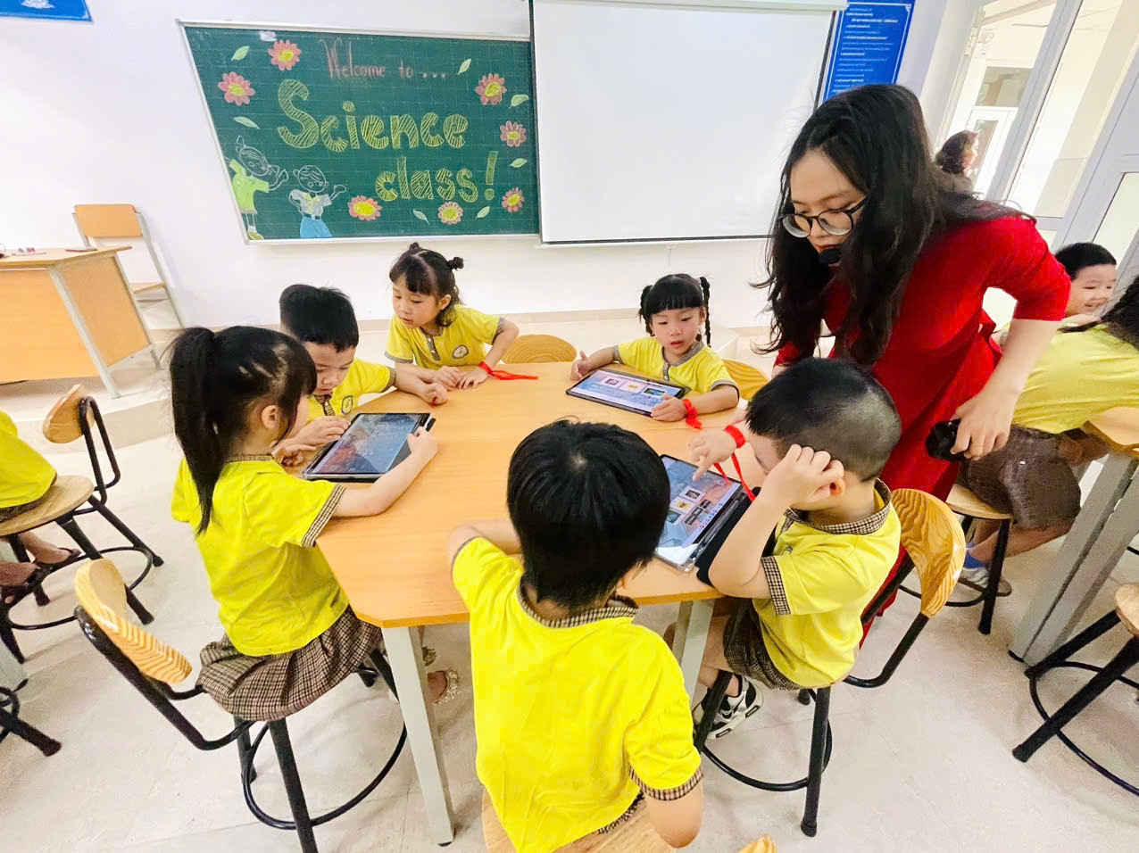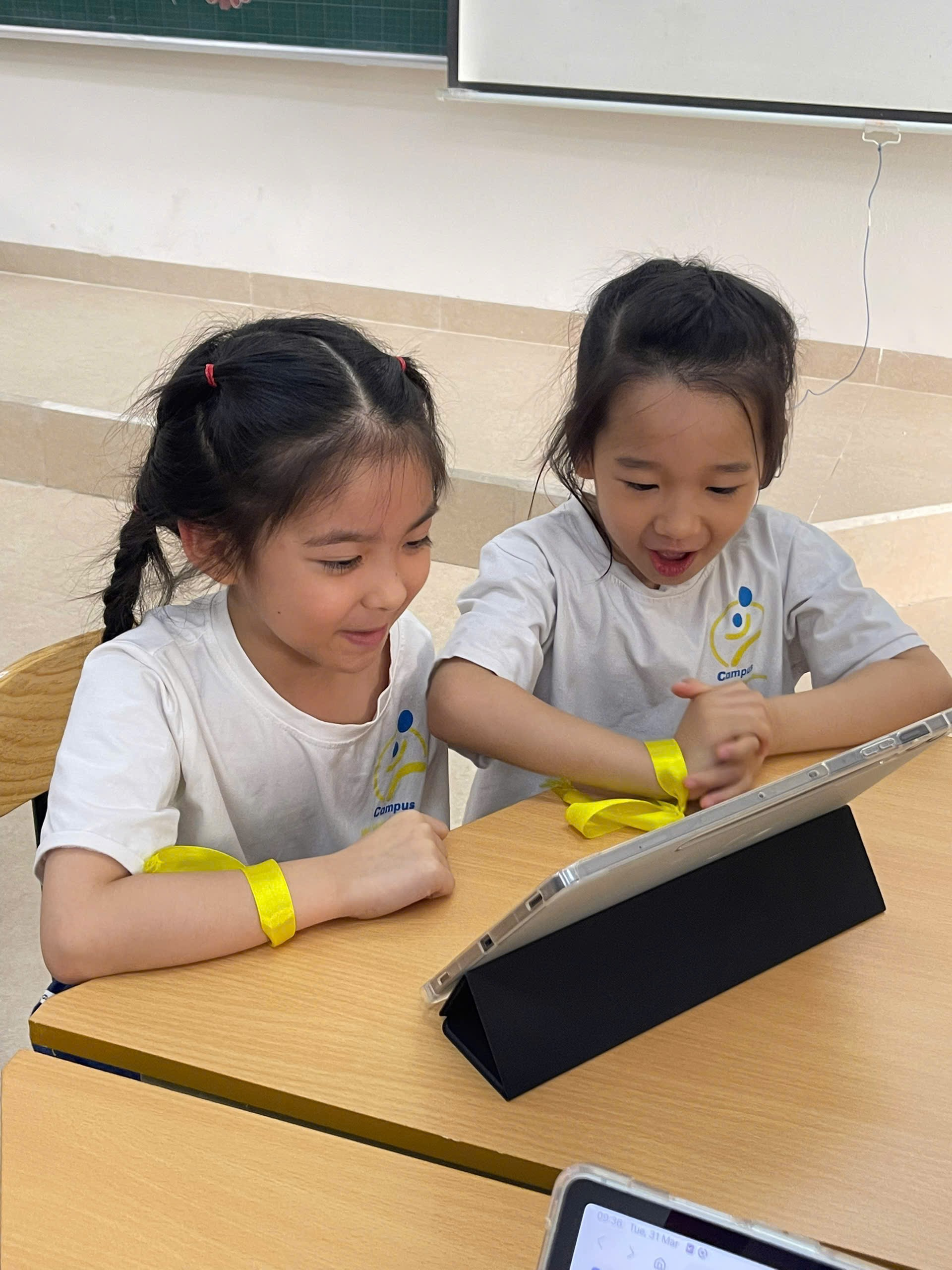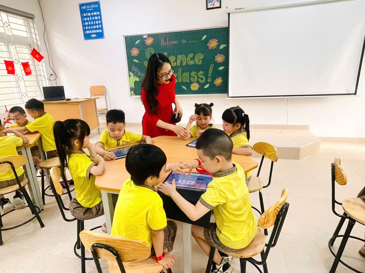 Trạm Lớp học thông minh: Các bé được làm quen với thiết bị hiện đại như máy tính bảng, bảng tương tác.