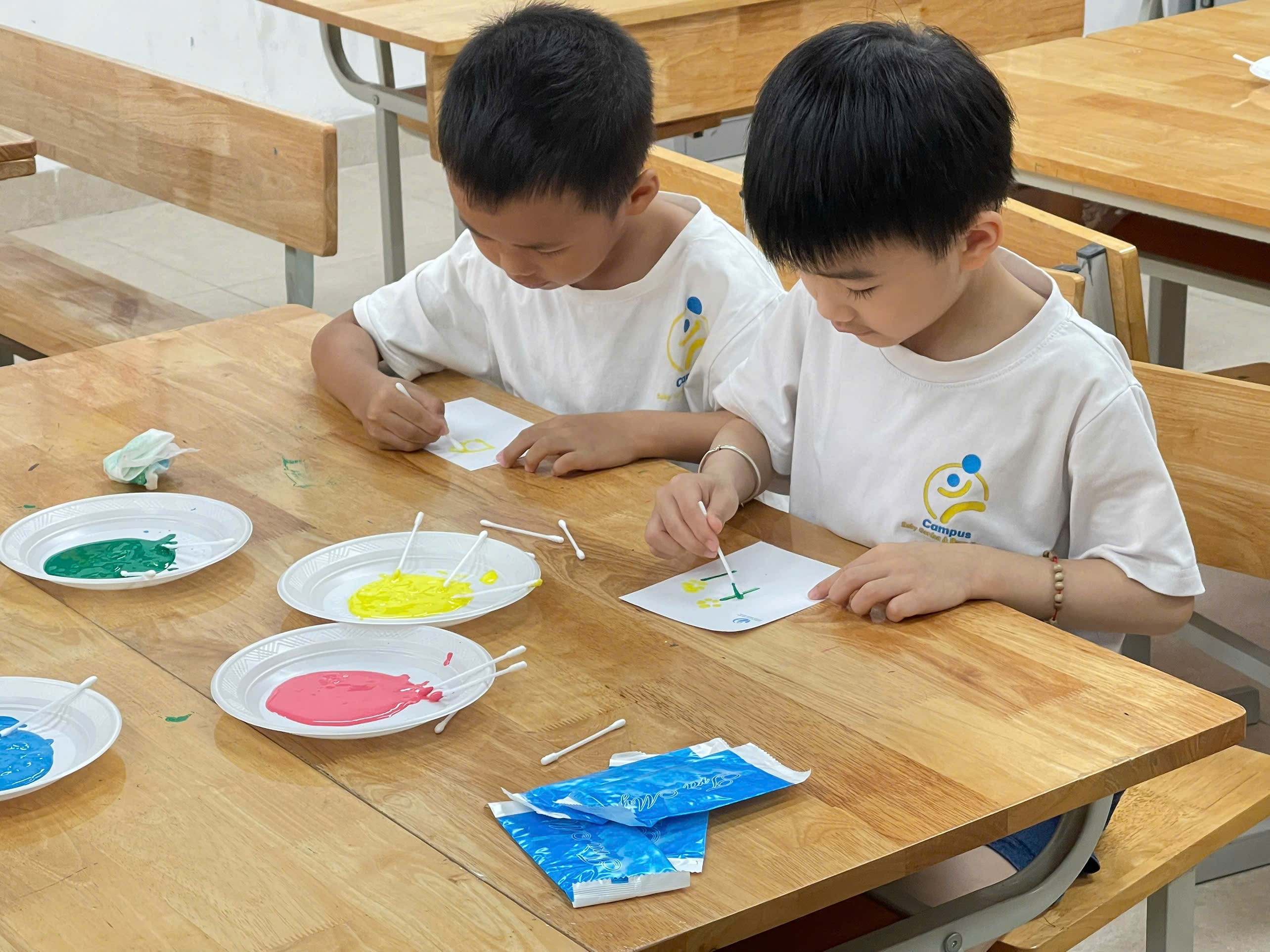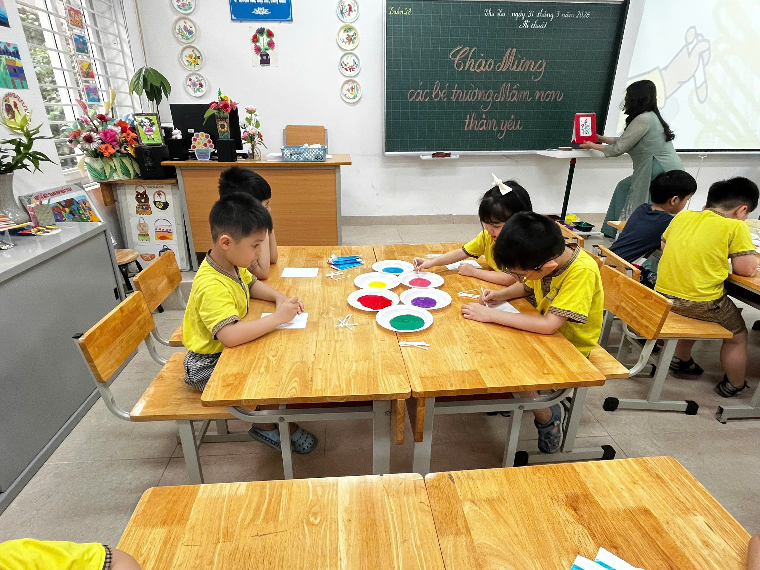 Các “họa sĩ nhí” say mê sáng tạo.