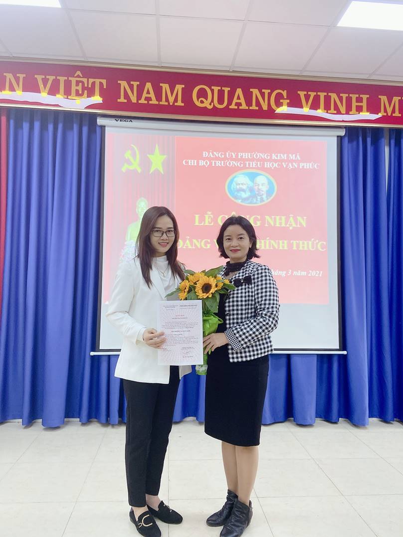 Ngày 02/3/2021 tôi đã vinh dự được Chi bộ Trường Tiểu học Vạn Phúc trao quyết định công nhận Đảng viên chính thức. Được kết nạp vào Đảng là một nguồn động viên, khích lệ lớn, giúp tôi thêm tin tưởng và vững bước trên con đường dài trước mắt. Hơn lúc nào hết, tôi cảm thấy Đảng thật gần gũi, những đảng viên đi trước chính là những người thầy đã giúp tôi thực hiện lý tưởng của Đảng và của bản thân. Với tôi, đây là một bước ngoặt lớn trong cuộc đời mình. Trong ngày kết nạp, chính các đồng chí trong chi bộ đã dành những lời tâm huyết để giao nhiệm vụ cho tôi: “Luôn nhớ bốn lời thề của đảng viên. Phải hiểu là đảng viên nghĩa là phải sống có trách nhiệm hơn. Phải làm thật tốt nhiệm vụ của mình, cô giáo phải gương mẫu, phải luôn nghĩ cho mọi người”.
