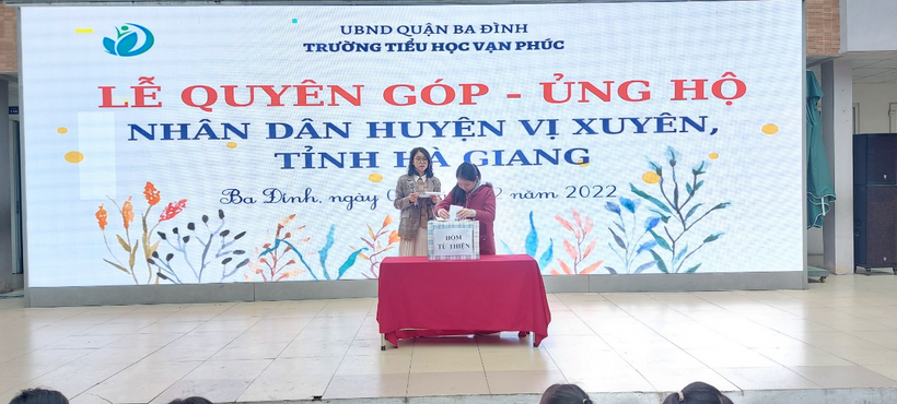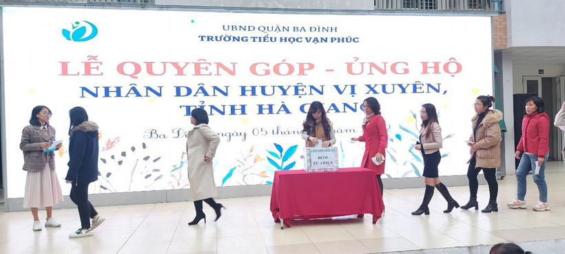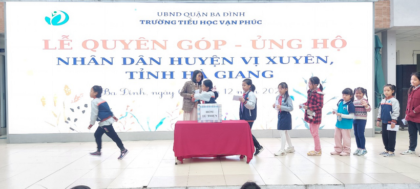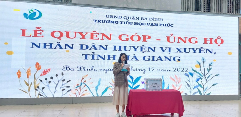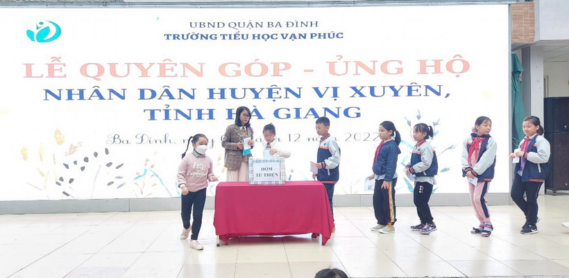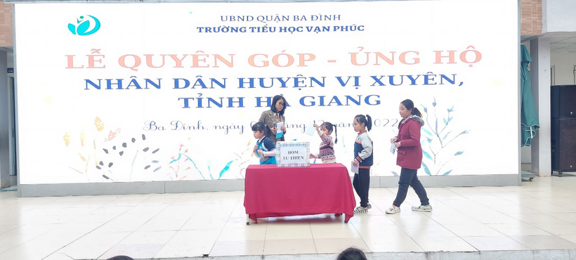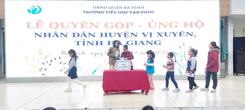 Ngày 05/12/2022 Liên đội Trường Tiểu học Vạn Phúc Hưởng ứng lời phát động theo Thư ngỏ ngày 21/11/2022 của Đoàn Thanh niên - Phòng GDĐT quận Ba Đình về việc Phát động quyên góp, ủng hộ nhân dân huyện Vị xuyên, tỉnh Hà Giang. Thầy và trò nhà trường đã tổ chức quyên góp ủng hộ nhân dân huyện Vị Xuyên, tỉnh Hà Giang trong giờ Sinh hoạt dưới cờ.