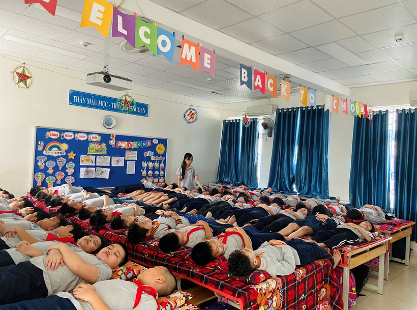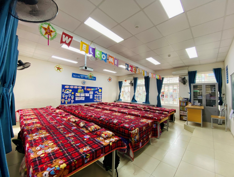 Để phát triển cơ thể học sinh và đáp ứng được khả năng tập trung học tập cùng các hoạt động thể lực đa dạng tốt thì hàng ngày các con cần được cung cấp đủ chất dinh dưỡng. Tập thể CB-GV-NV-PH trường đã chung tay xây dựng bữa ăn học đường ngon, đủ lượng, đủ chất, đảm bảo an toàn vệ sinh thực phẩm cho học sinh. Bắt đầu từ việc trang thiết bị cơ sở vật chất ở nhà bếp đến phòng ăn, ngủ đầy đủ đảm bảo cho học sinh có sức khỏe tốt. Bếp bán trú được thiết kế một chiều, rộng rãi, sạch sẽ, sắp đặt ngăn nắp, gọn gàng, khoa học với đồ dùng hiện đại.