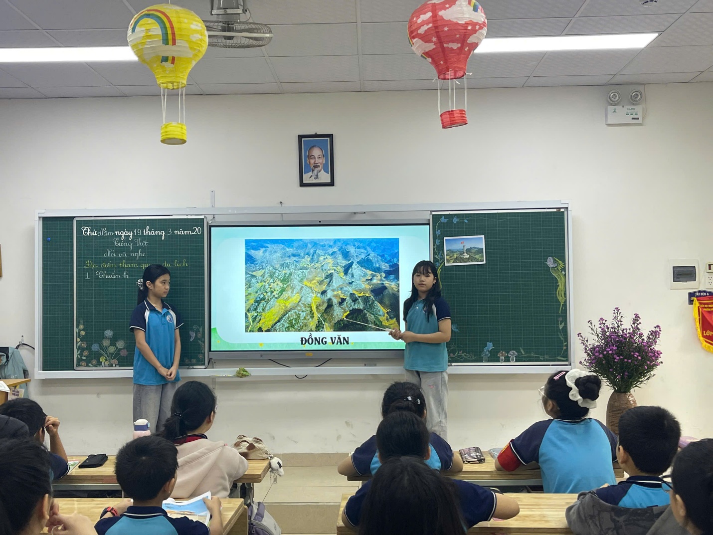 Mở đầu “chuyến đi”, nhóm 1 đã đưa cả lớp đến với mảnh đất Đồng Văn (Tuyên Quang) qua những thước phim và tranh ảnh sống động. Vẻ đẹp kỳ vĩ của dòng sông Nho Quế xanh ngắt, sự hiểm trở của đèo Mã Pì Lèng, niềm tự hào nơi cột cờ Lũng Cú và sắc tím mộng mơ của cánh đồng hoa tam giác mạch đã hoàn toàn chinh phục người xem.