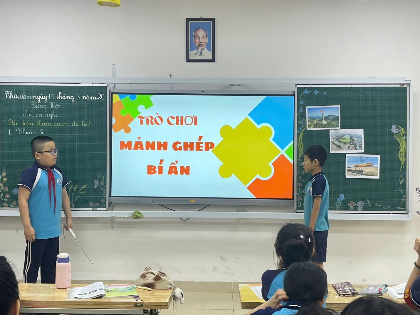 Ngay từ những phút đầu tiên, không khí lớp học đã trở nên sôi động nhờ phần khởi động đầy sáng tạo dưới sự điều khiển của bạn Hà My. Cả lớp như được bước lên một chuyến tàu ảo, đi du lịch qua màn ảnh nhỏ với đoạn video quảng bá du lịch Việt Nam rực rỡ sắc màu.