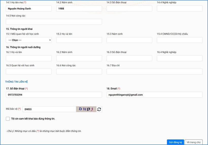 Bước 6: Sau khi hoàn thiện hồ sơ học sinh, PHHS nhập Mã bảo vệ, Tích cam kết khai báo đúng thông tin và [Gửi đăng ký] để gửi hồ sơ của học sinh về Phòng giáo dục.