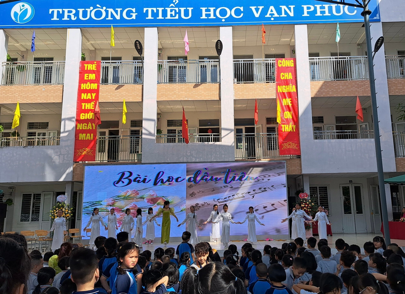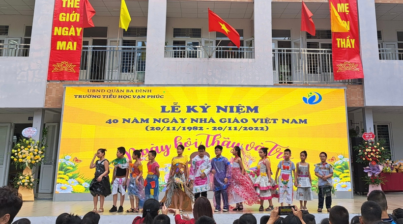 Mở đầu Ngày hội là hai tiết mục văn nghệ chào mừng hết sức sôi động của các em học sinh khối 1 và khối 4 trường Tiểu học Vạn Phúc. Các em nhỏ khối 1 rất vui tươi và tự tin thể hiện tiết mục múa hát “Mái trường nơi em học bao điều hay” như một món quà đặc biệt dành tặng cho thầy cô.