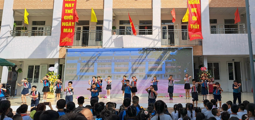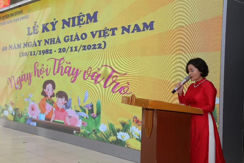 Tiếp theo chương trình là phần diễn văn kỷ niệm ngày Nhà giáo Việt Nam 20/11 và sơ kết thi đua đợt 1 năm học 2022-2023 của Nhà giáo Phùng Tố Nga - Bí thư Chi bộ - Hiệu trưởng nhà trường.