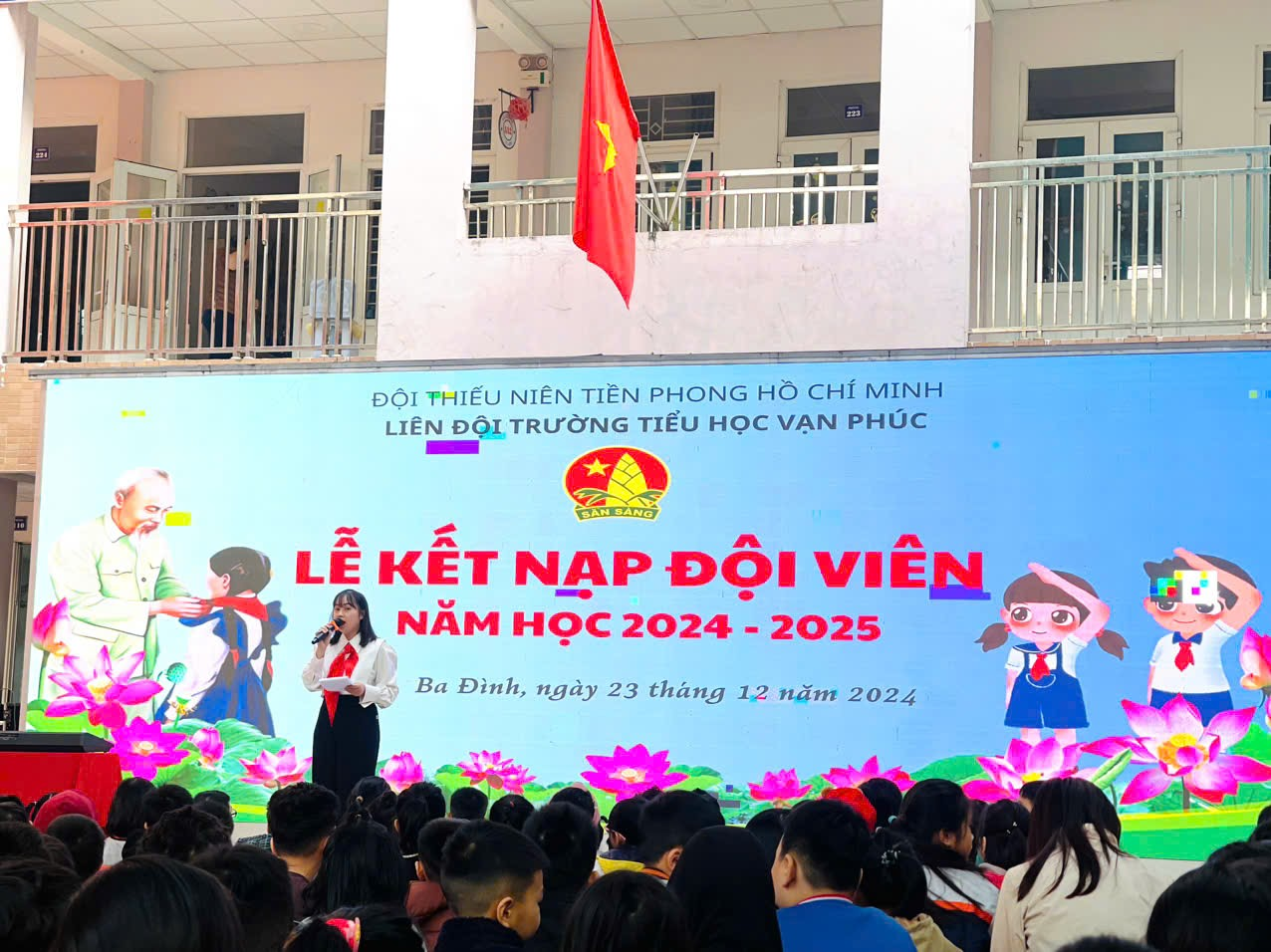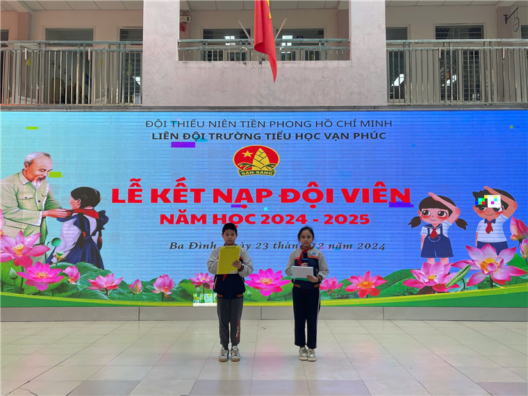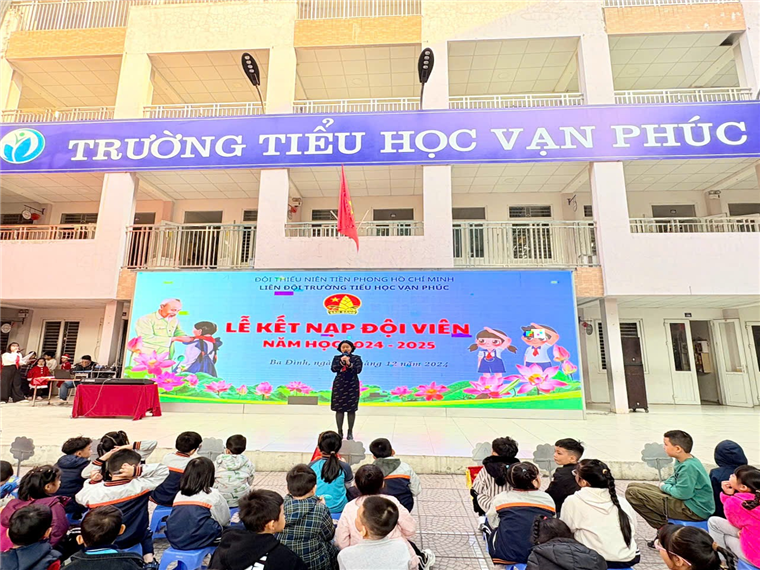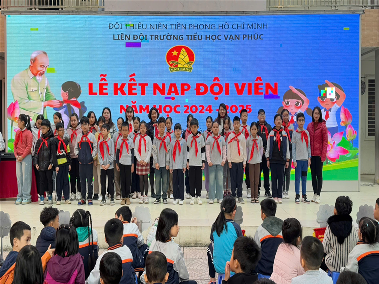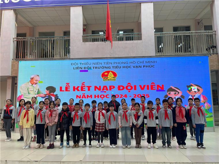 Thực hiện Kế hoạch năm học, sáng ngày 23/12/2024, hòa trong không khí tưng bừng của cả nước chào mừng kỉ niệm 80 năm Ngày thành lập Quân đội Nhân dân Việt Nam (22/12/1944 - 22/12/2024), Trường Tiểu học Vạn Phúc đã long trọng tổ chức Lễ Kết nạp đội viên đợt 1 năm học 2024-2025 cho 30 em học sinh khối 4,5 có quá trình học tập và rèn luyện tốt, đã học lớp “Tập huấn, bồi dưỡng nghiệp vụ công tác Đội”, được tập thể lựa chọn đứng trong hàng ngũ của Đội Thiêu niên Tiền phong Hồ Chí Minh.