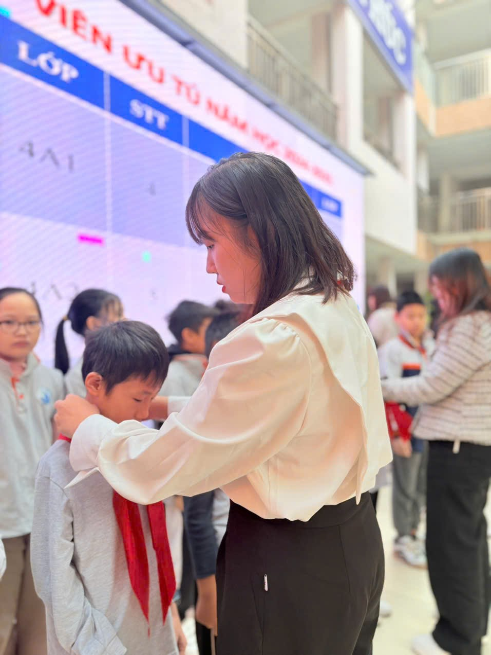Màu khăn đỏ thắm trên vai như lời nhắc nhở các em phải tiếp tục phấn đấu, nỗ lực hơn nữa để trở thành Đội viên tốt, xứng đáng là Con ngoan trò giỏi - Cháu ngoan Bác Hồ. Đây sẽ là một kỉ niệm thật đẹp của các em dưới mái trường Vạn Phúc yêu thương./.